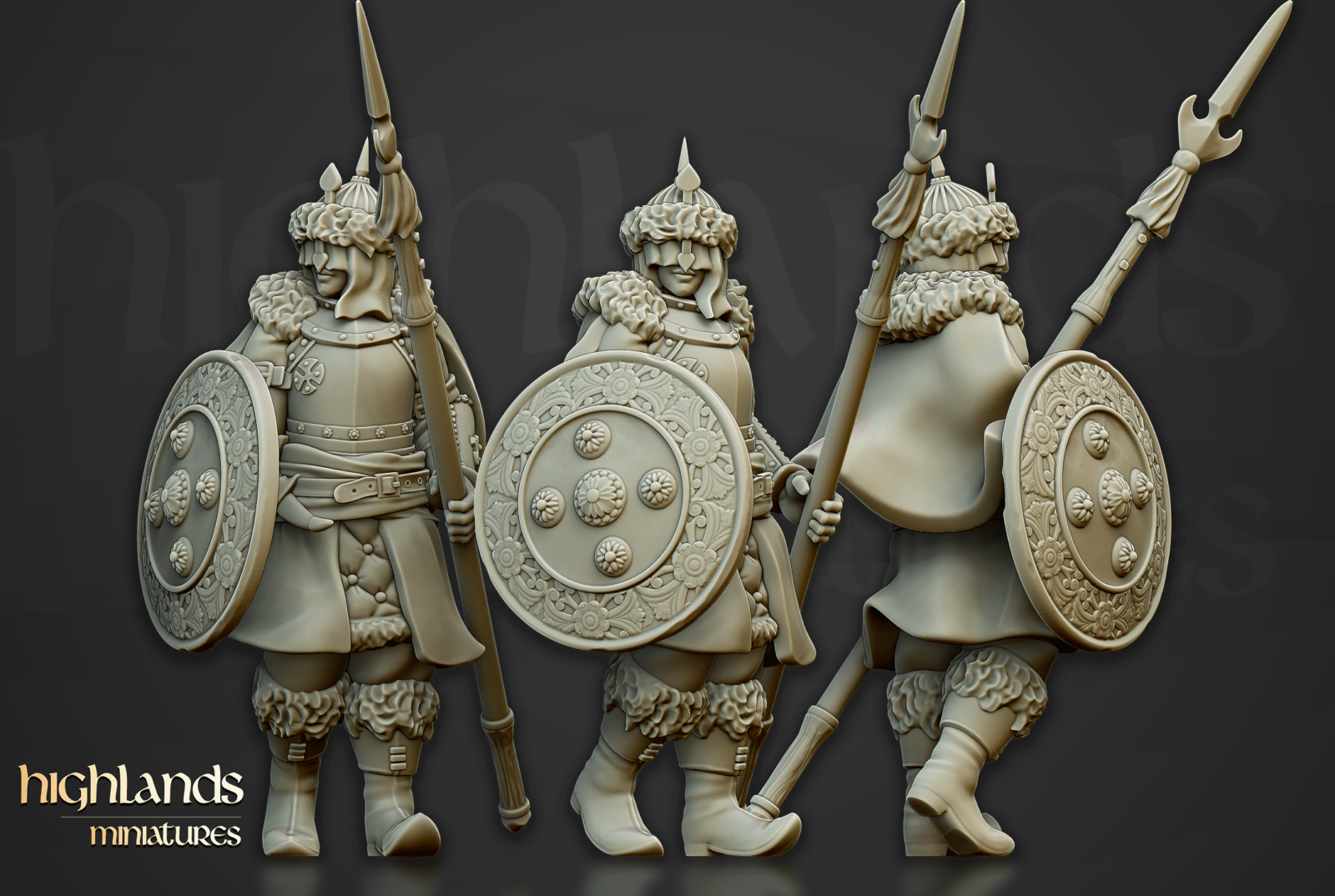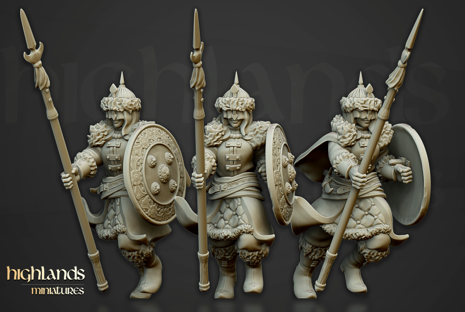 Oferujemy zestaw dziesięciu figurek Heavy Infantry with spears (Daughters of Volhynia od Highland Miniatures), wydrukowany na drukarce żywicznej w rozdzielczości 4k.