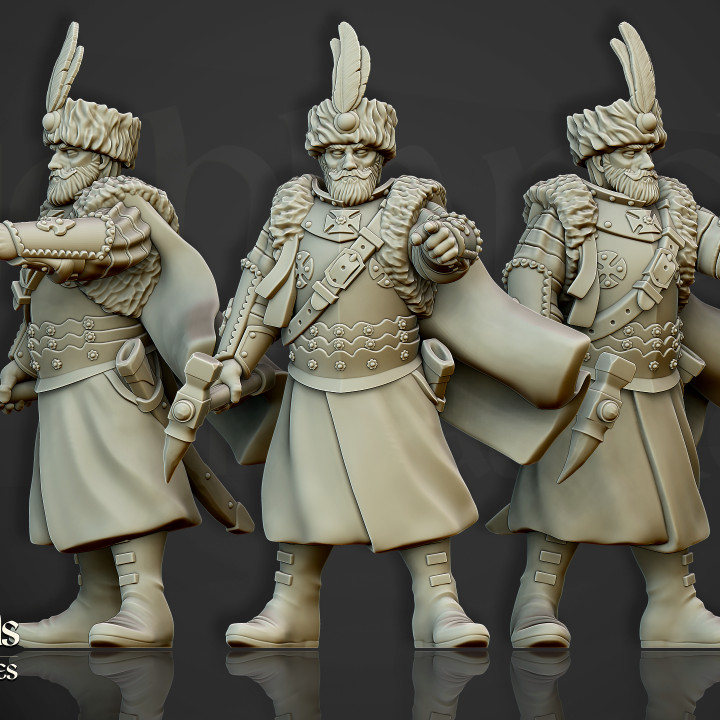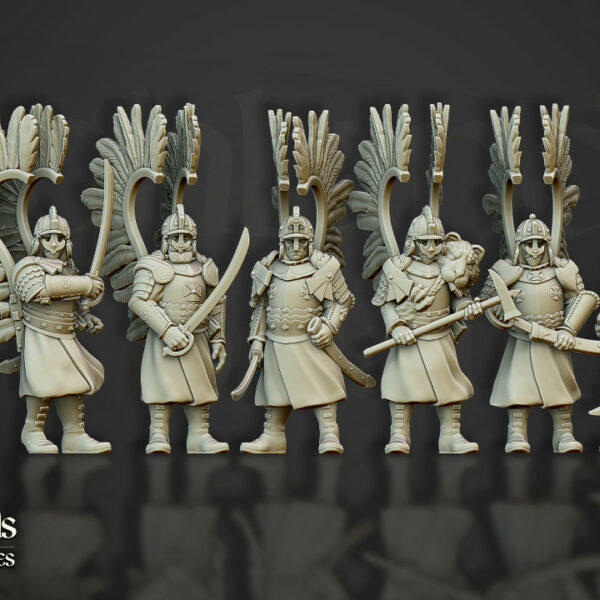 Oferujemy zestaw dziesięciu figurek Winged Hussars on Foot od Highlands Miniatures, wydrukowany na drukarce żywicznej.