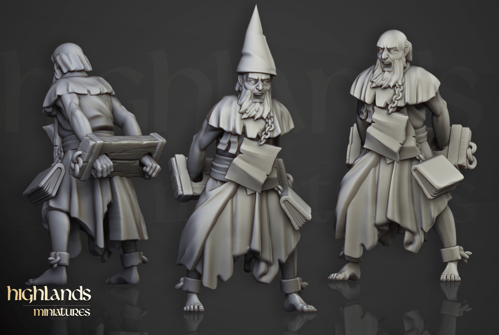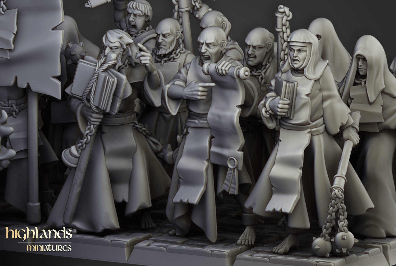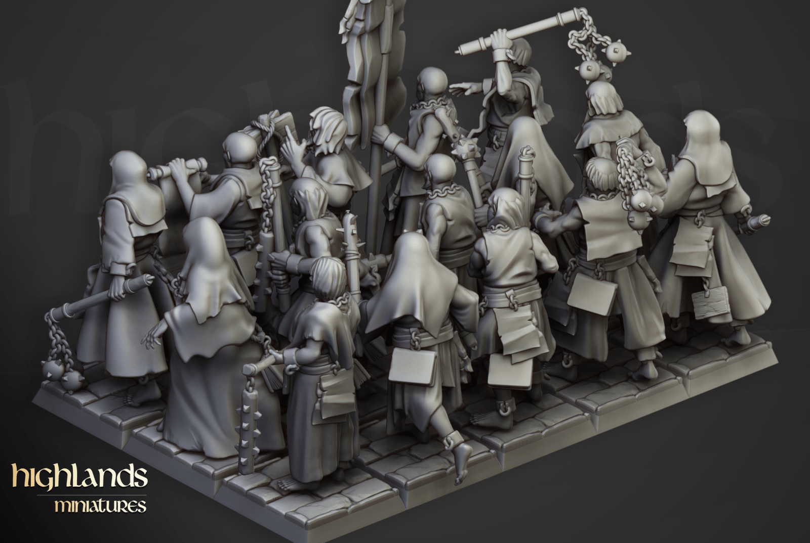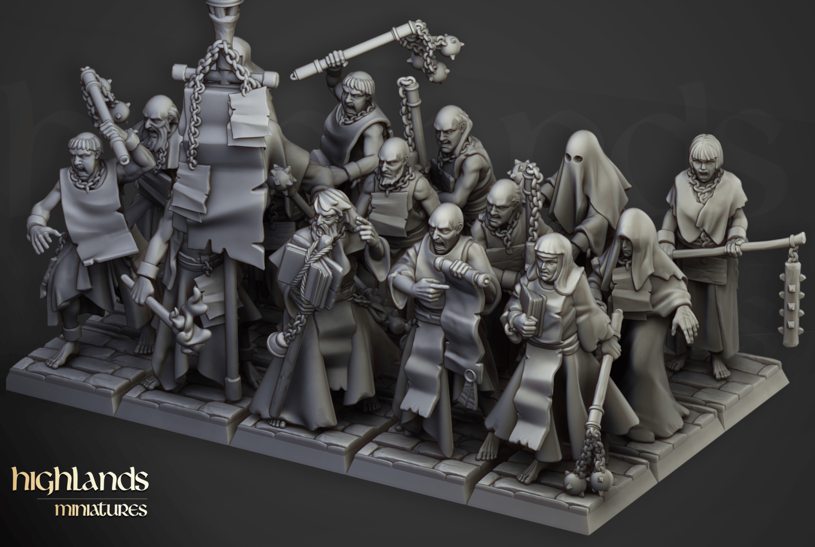 Oferujemy zestaw dziesięciu figurek Flagellants (Fanatical Zealots od Highland Miniatures), wydrukowany na drukarce żywicznej w rozdzielczości 4k.