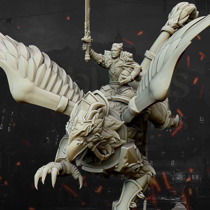 Oferujemy jedną figurkę Equitan Lord on Hippogriff (Alexander, the Young Prince od Highland Miniatures), wydrukowaną na drukarce żywicznej w rozdzielczości 4k.