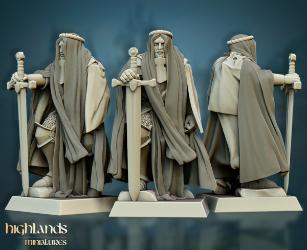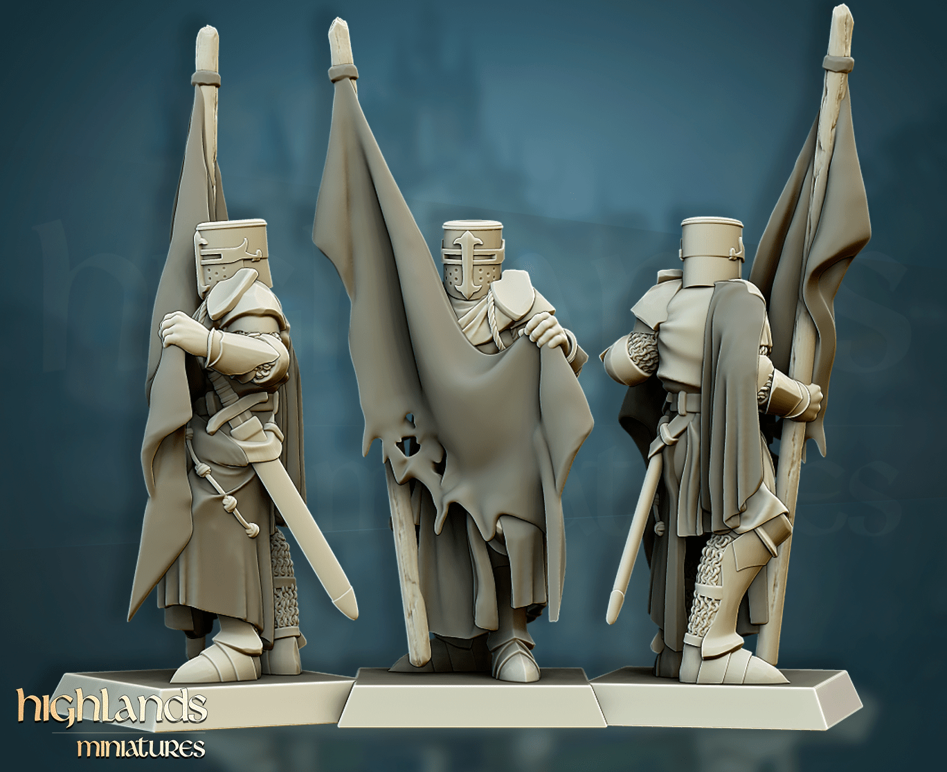 Oferujemy zestaw trzech figurek Men-At-Arms Command Group (Crusader Knights Command Group od Highland Miniatures), wydrukowany na drukarce żywicznej w rozdzielczości 4k.