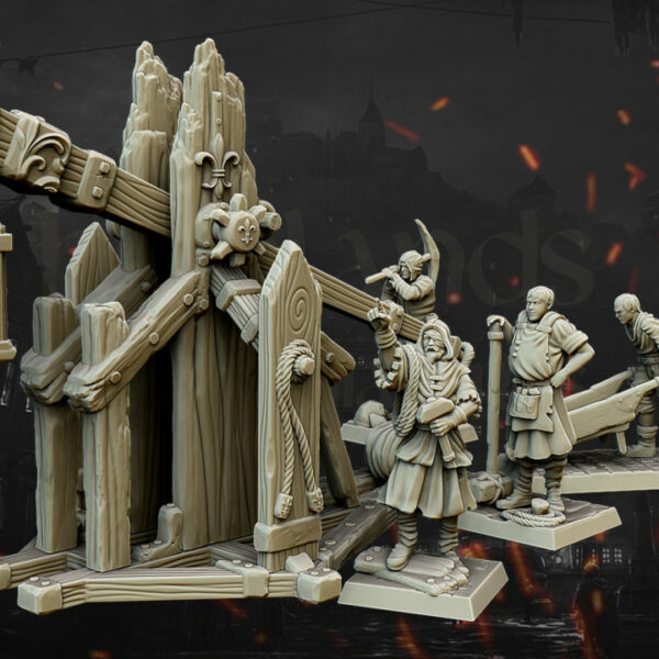 Oferujemy zestaw Trebuchet (Medieval Trebuchet od Highland Miniatures), wydrukowany na drukarce żywicznej w rozdzielczości 4k wraz z czwórką figurek obsługi.