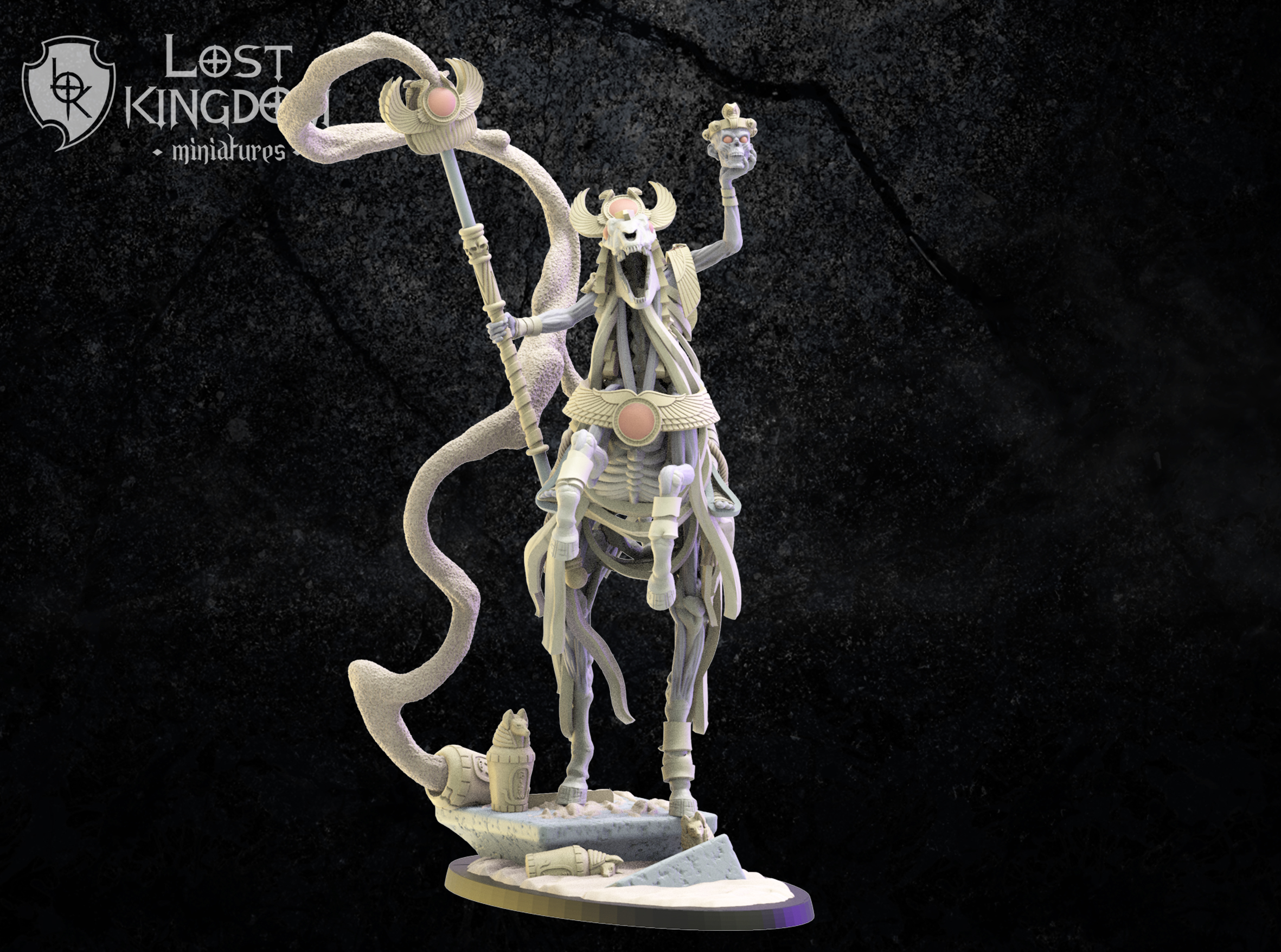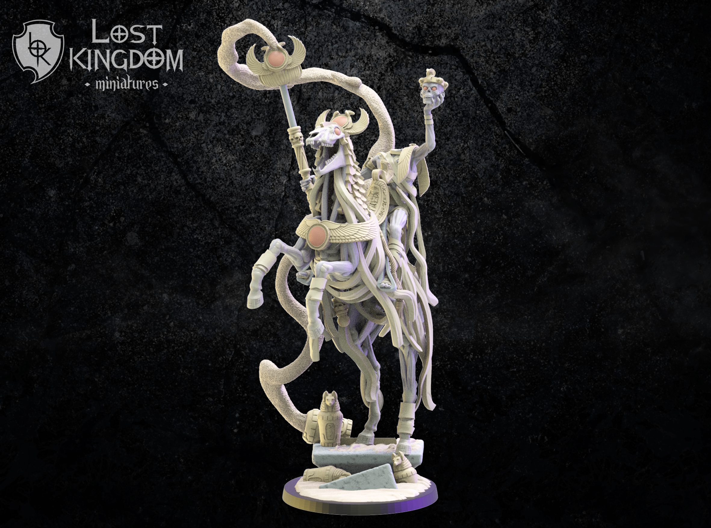 Oferujemy zestaw Death Cult Hierarch on Skeletal Horse (Seb, Headless Sorcerer od Lost Kingdom), wydrukowany na drukarce żywicznej w rozdzielczości 4k.