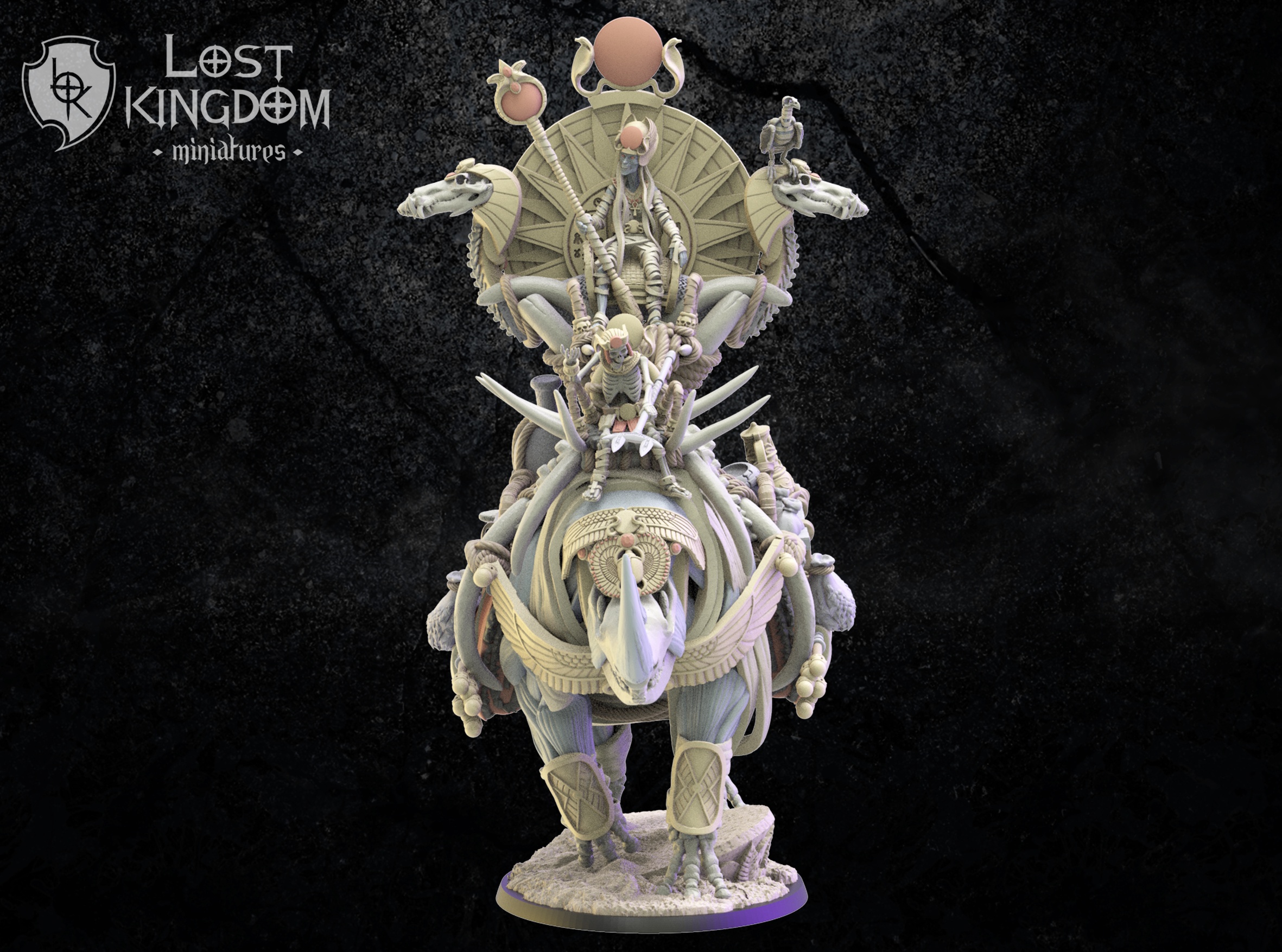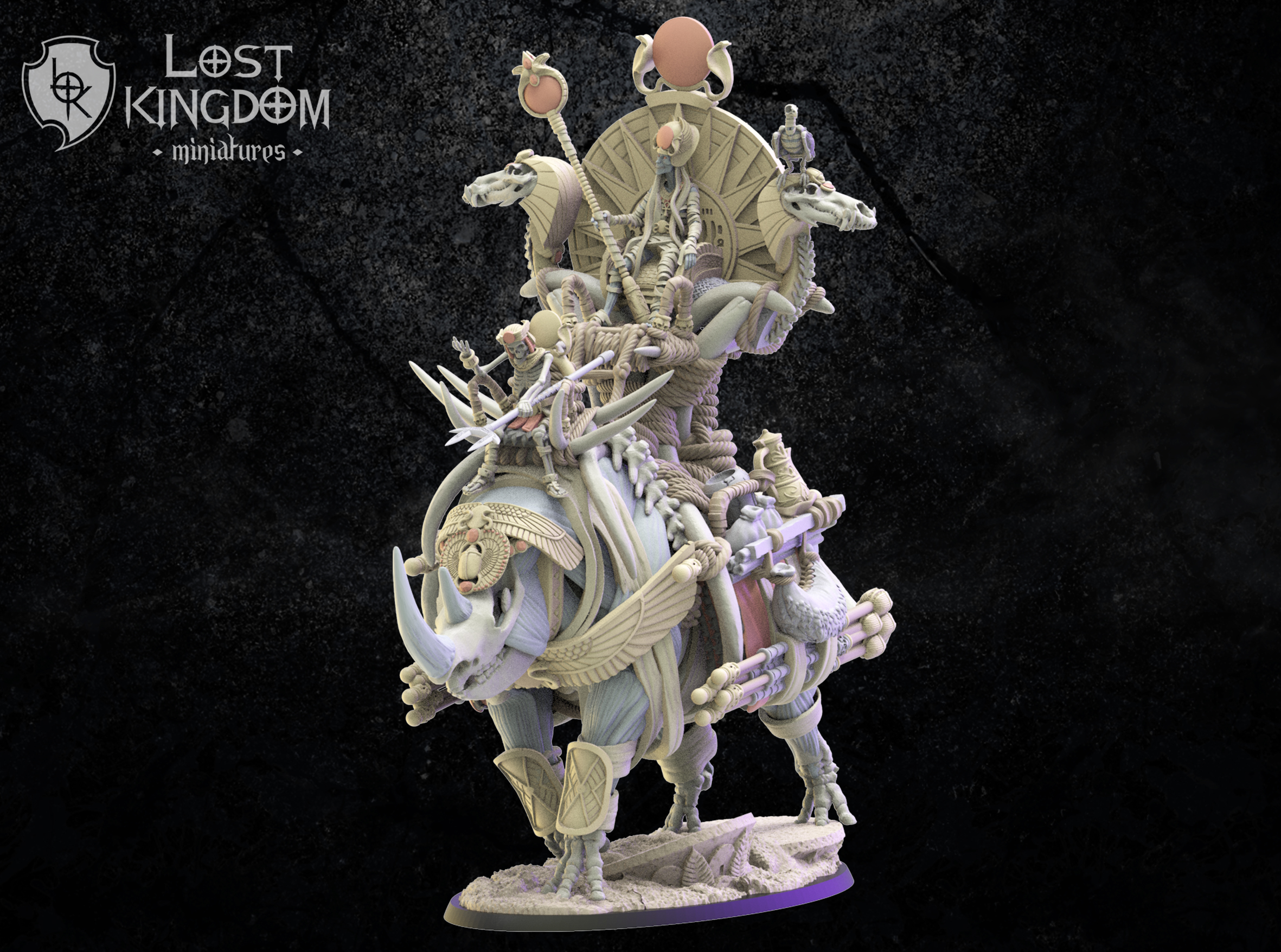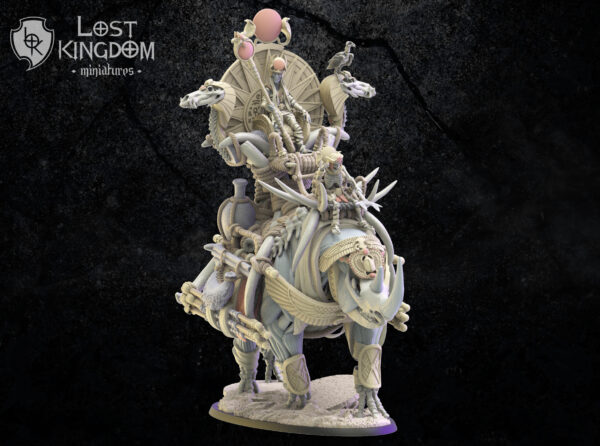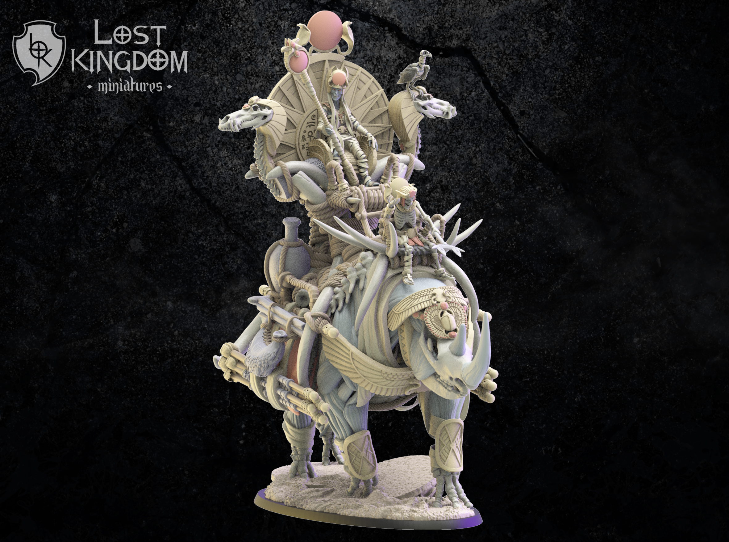Oferujemy zestaw Hathor, Beduin Sorcerer on Rhinoceros od Lost Kingdom, wydrukowany na drukarce żywicznej w rozdzielczości 4k.