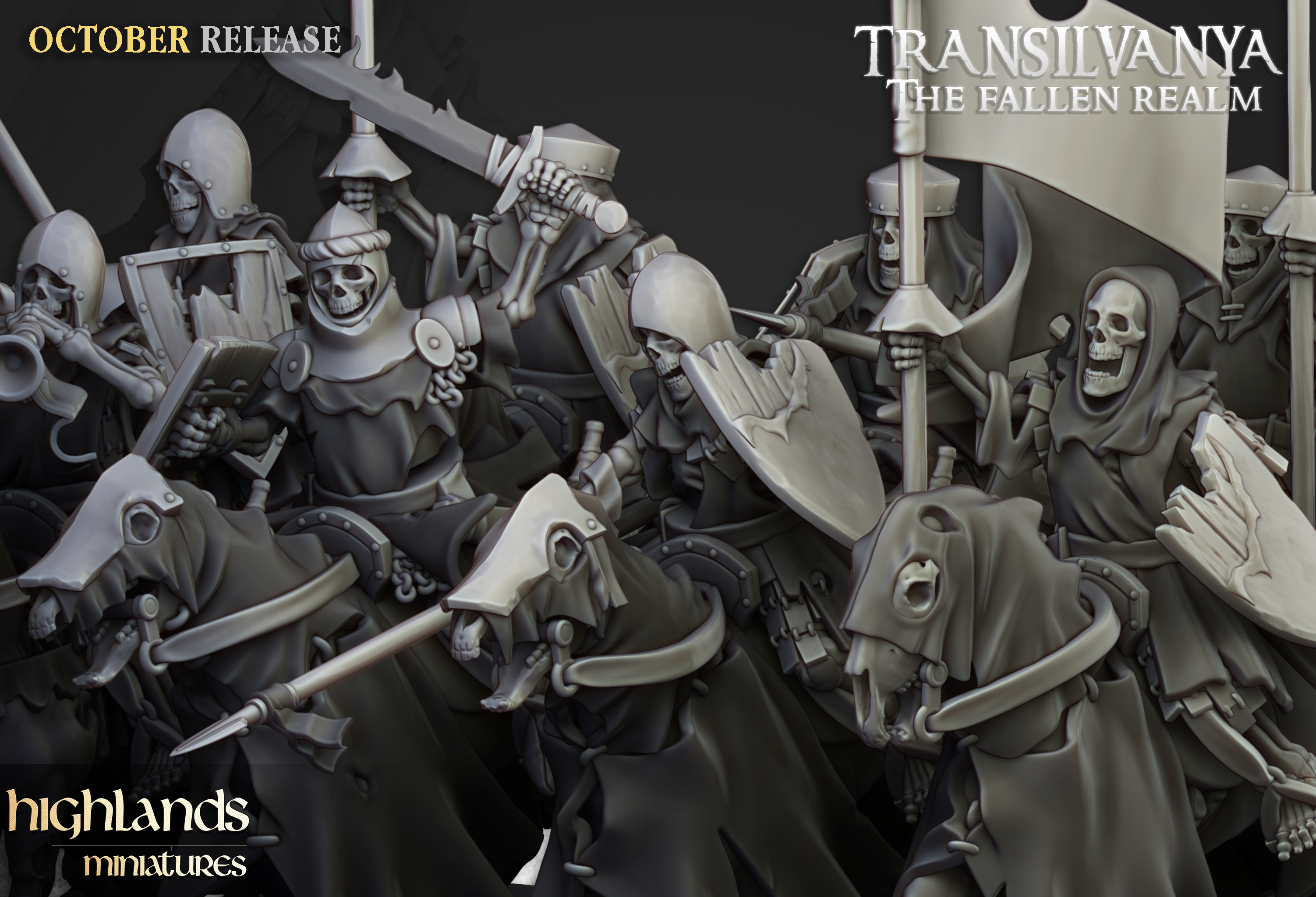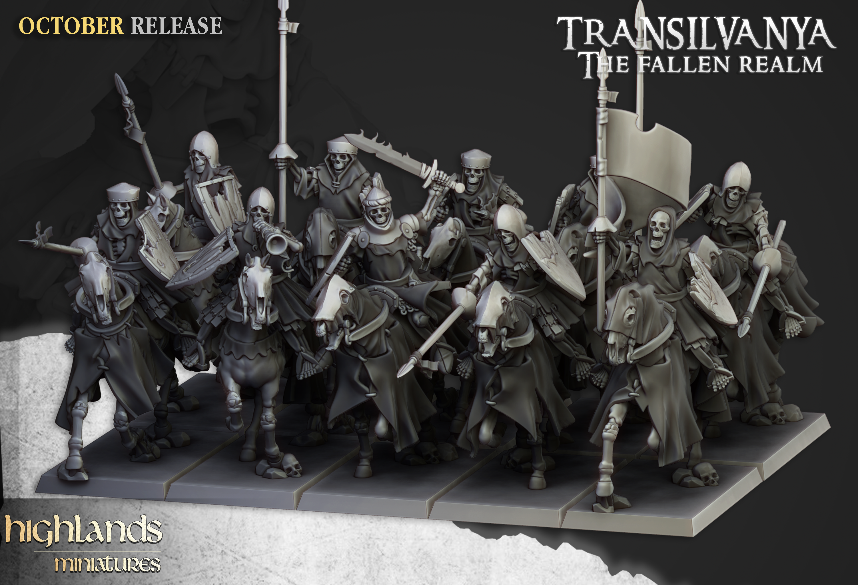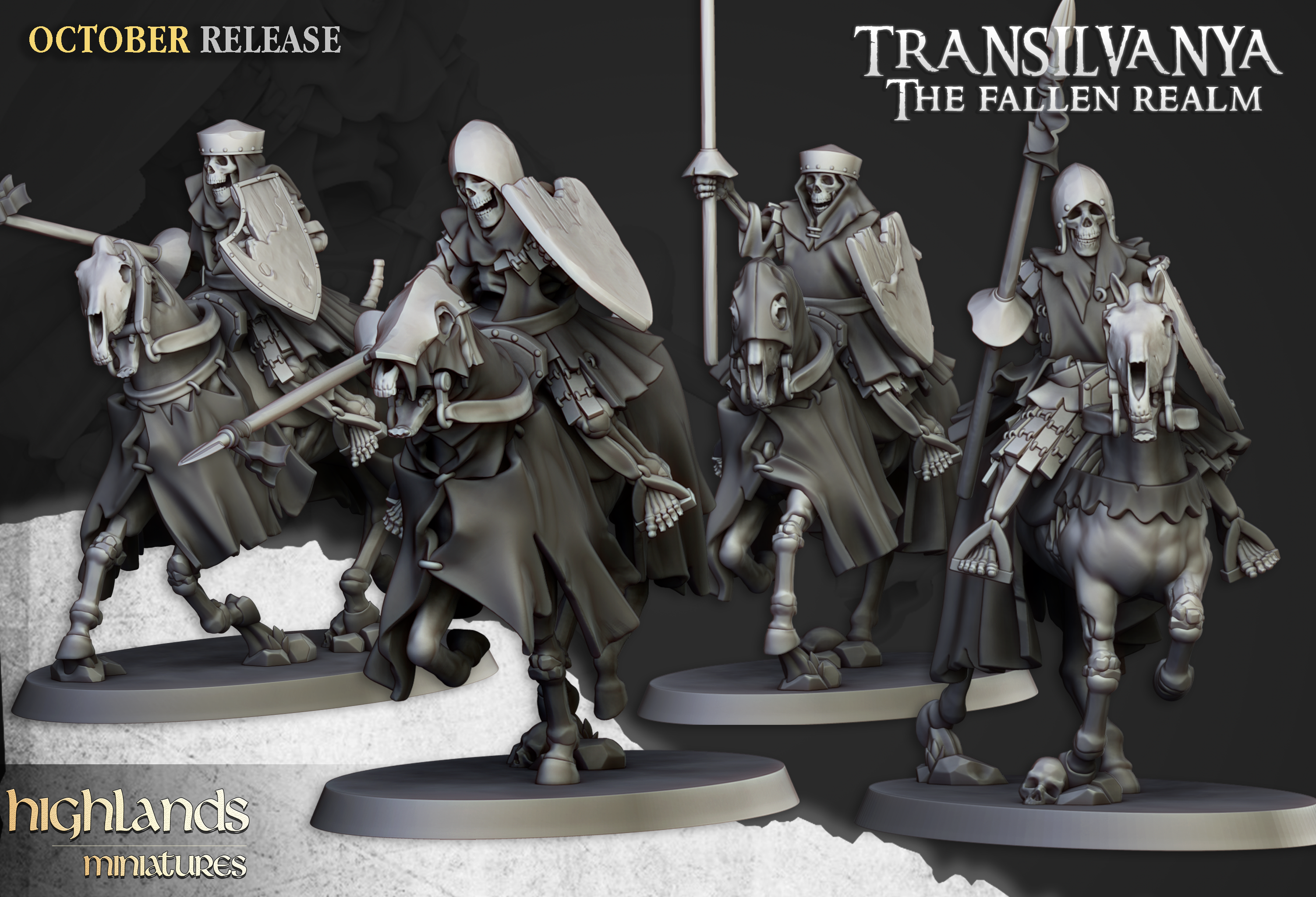 Oferujemy zestaw pięciu figurek Barrow Knights (Mounted Skeletons od Highland Miniatures), wydrukowany na drukarce żywicznej w rozdzielczości 4k.