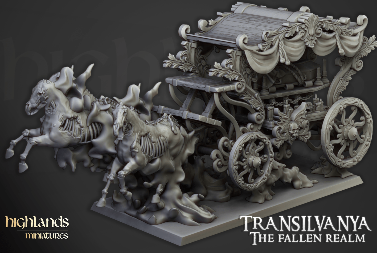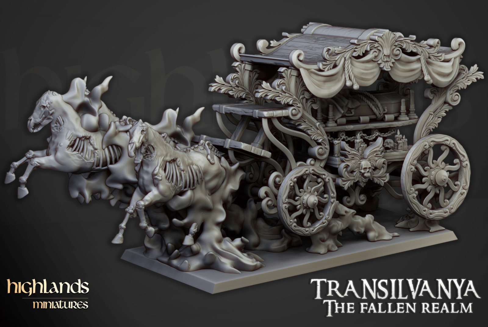 Oferujemy zestaw figurek Dark Coach (Undead Boyar Chariot od Highland Miniatures), wydrukowany na drukarce żywicznej w rozdzielczości 4k.